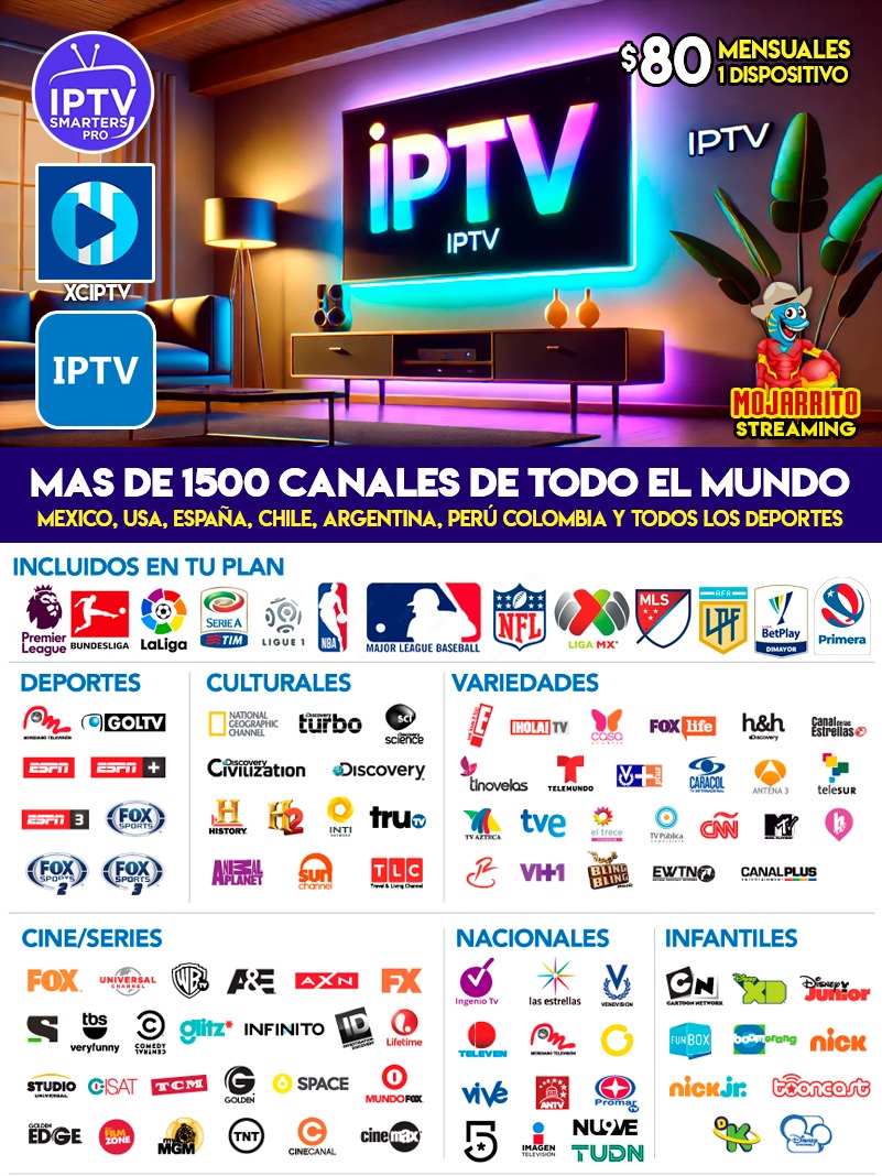 Disfruta de un a cuenta IPTV con más de 1500 canales en vivo nacionales e internacionales, deportivos, musicales, cine, culturales, películas y series. Canales de Mexico, USA, España, Chile, Argentina, Perú Colombia y todos los deportes.