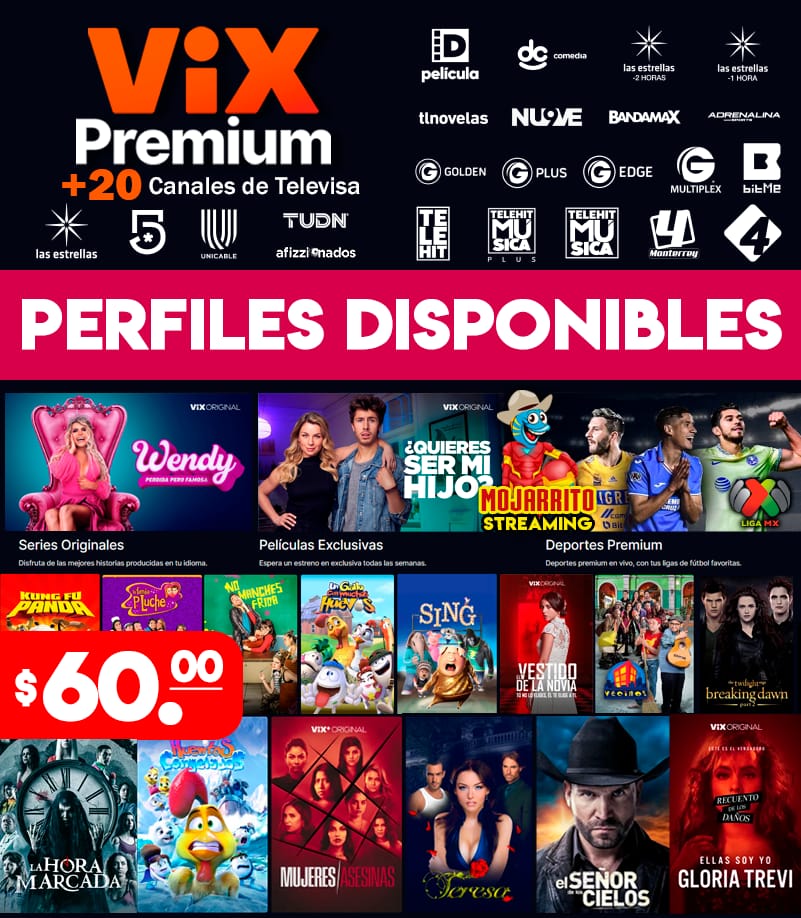 Con el pago de tu mensualidad tienes derecho a 1 perfil para disfrutar de todo el contenido premium de Vix, Películas, Series, Novelas, Documentales, La Liga MX, etc. Así como más de 20 canales de Televisa en vivo.