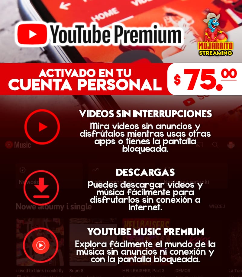 Incluye todos los beneficios de la cuenta premium y YouTube Music Premium. Servicio mensual renovable.